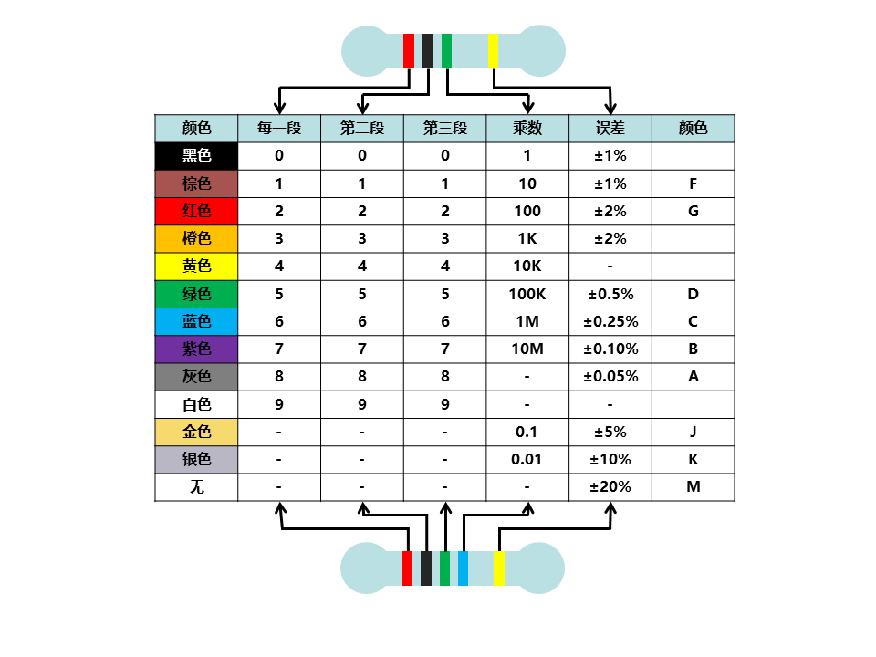 四环电阻前二环为数字,第三环表示阻值倍乘的数,最后一环为误差;五环电阻前三环为数字,第四环表示阻值倍乘的数,最后一环为误差。误差通常也是金、银和棕三种颜色(金的误差:5%,银的误差:10%,棕色的误差:1%,无色的误差:20%,很少用的绿色表示误差:0.5%)。